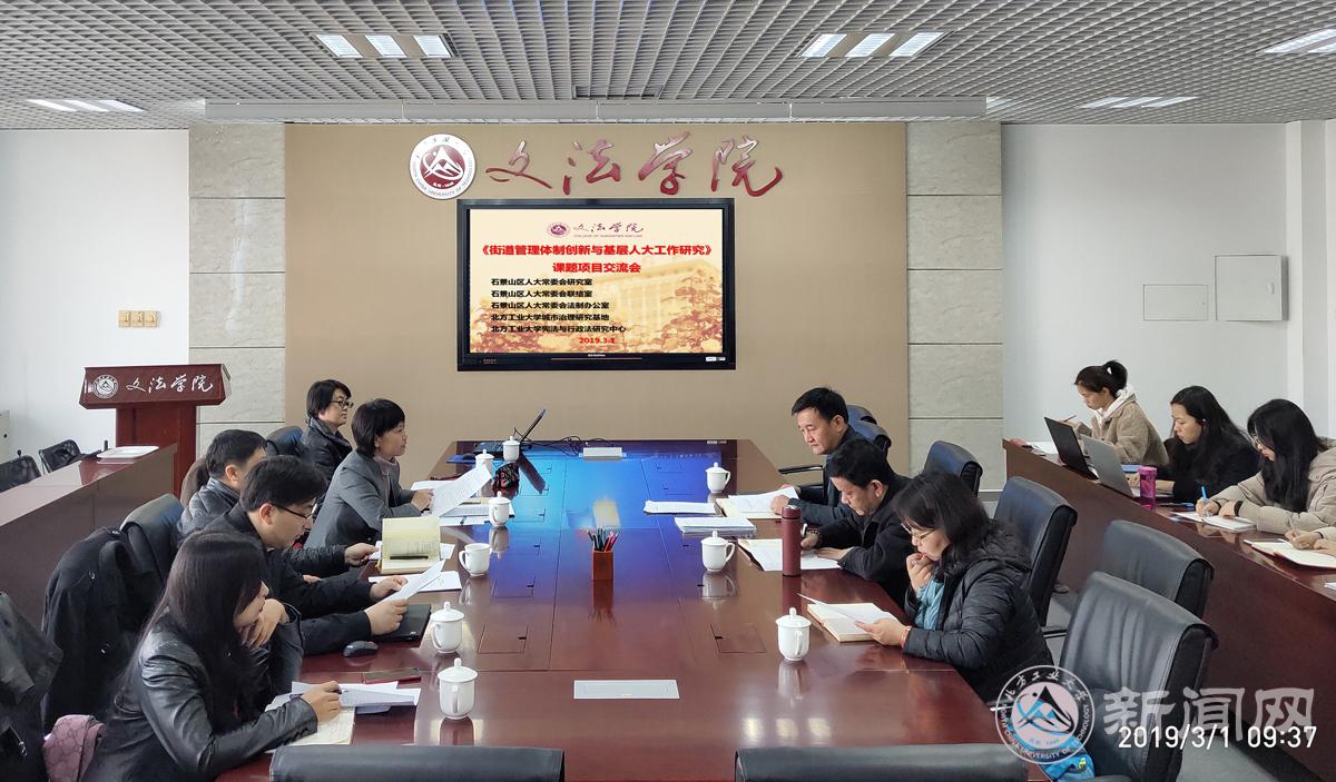 3月1日,bat365与石景山区人大常委会合作课题《街道管理体制创新与基层人大工作研究》项目交流活动在文法学院学术会议室举行。石景山区人大常委会研究室、法制办、代表联络室等相关领导参会,文法学院宪法与行政法学教师团队成员、研究生参加了交流活动。会议由文法学院院长刘泽军教授主持。
