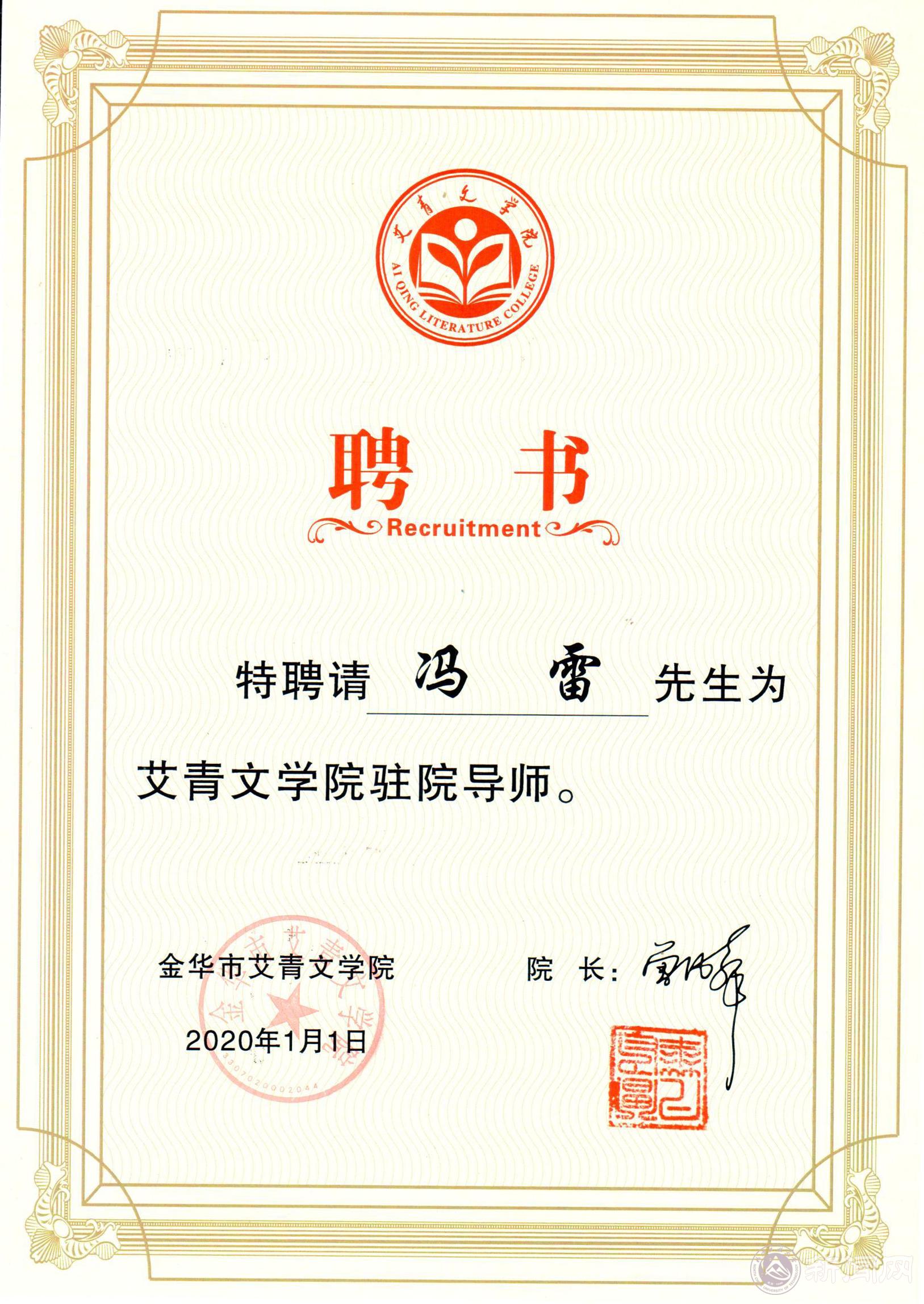 近日,bat365文法学院中文系教师冯雷被艾青文学院聘为驻院导师。