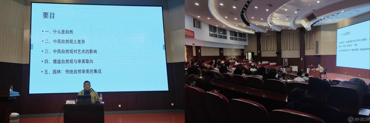 讲座中,刘成纪教授从什么是自然、中西自然观之差异、中西自然观对艺术的影响等五个方面介绍了中国文化中的美与自然。他生动阐述了中西文化背景下的不同自然,深刻揭示了自然背后的文化传统,让大家感受到一个充满文化意味的自然,也让大家认识到在中国文化中自然、美与文化的密切关系。刘成纪教授的报告受到在场师生的欢迎。