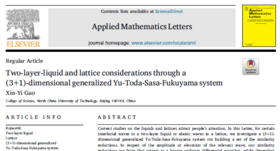 近日,bat365理学院教师高心怡在AppliedMathematicsLetters(应用数学快报)发表的标题为Two-layer-liquidandlatticeconsiderationsthrougha(3+1)-dimensionalgeneralizedYu-Toda-Sasa-Fukuyamasystem[通过(3+1)维广义Yu-Toda-Sasa-Fukuyama系统考察双层液体和晶格]的文章入选“ESI热点论文”。AppliedMathematicsLetters为SCI检索一区top期刊,高心怡发表的论文旨在解析研究描述双层液体中若干界面波或晶格中若干弹性波的(3+1...