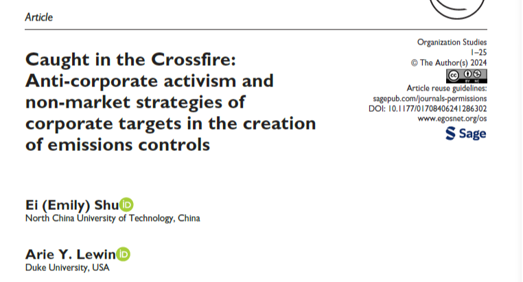 近日,经济管理学院朱瑛教授以第一作者身份在工商管理领域顶级国际期刊,FMS管理科学国际A级期刊《OrganizationStudies》上发表题为《CaughtintheCrossfire:Anti-CorporateActivismandNon-MarketStrategiesofCorporateTargetsintheCreationofEmissionsControls》的学术论文。该论文运用定性数据分析法(qualitativedataanalysis),分析了日本环境保护団体与汽车行业巨头公司的对峙中,资源弱小的非目标企业(non-targetfirms)如何...